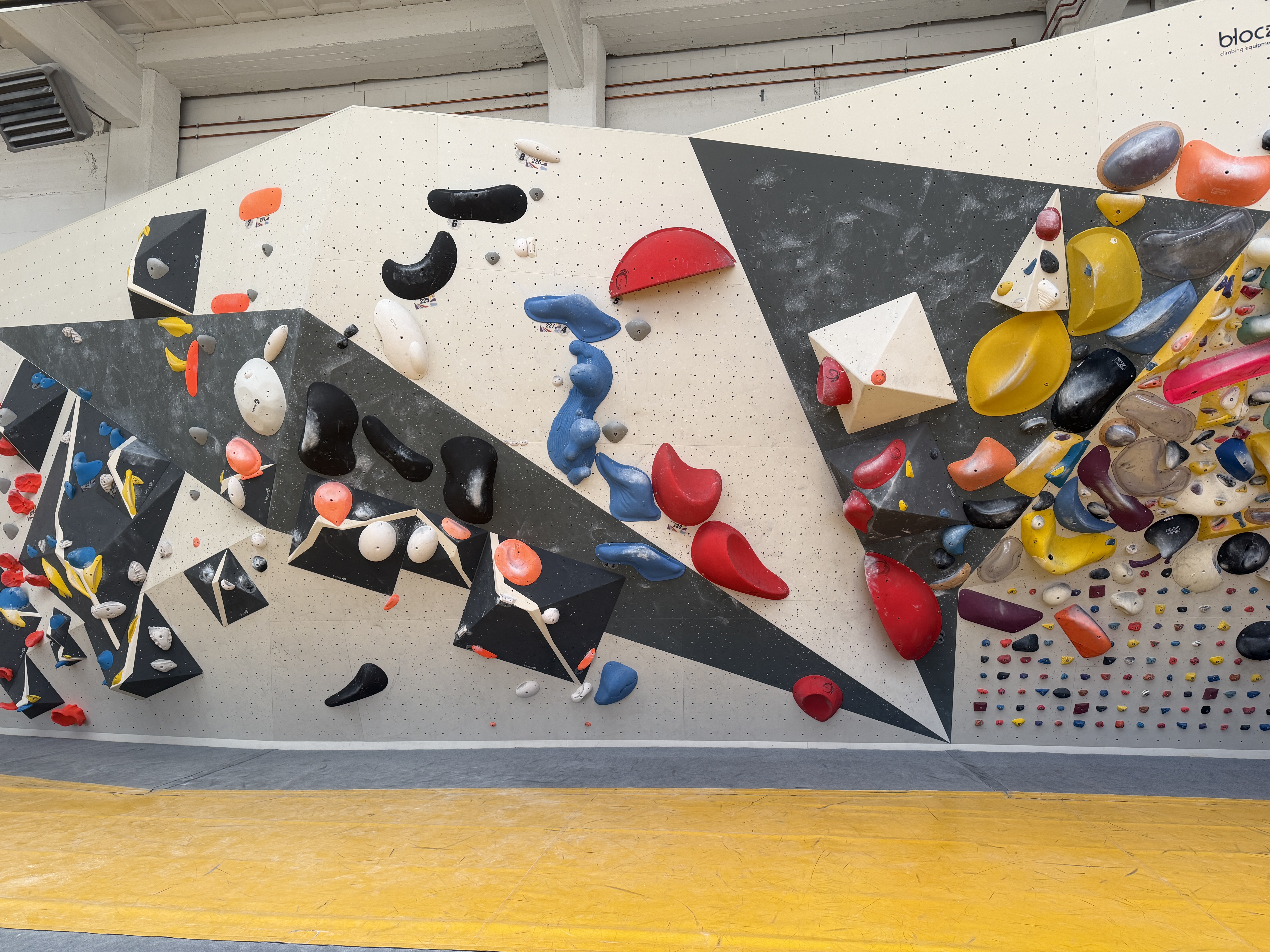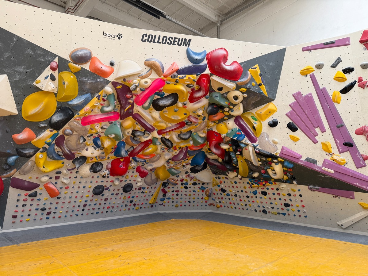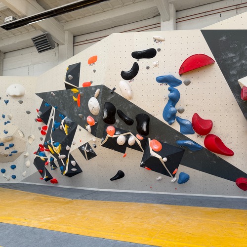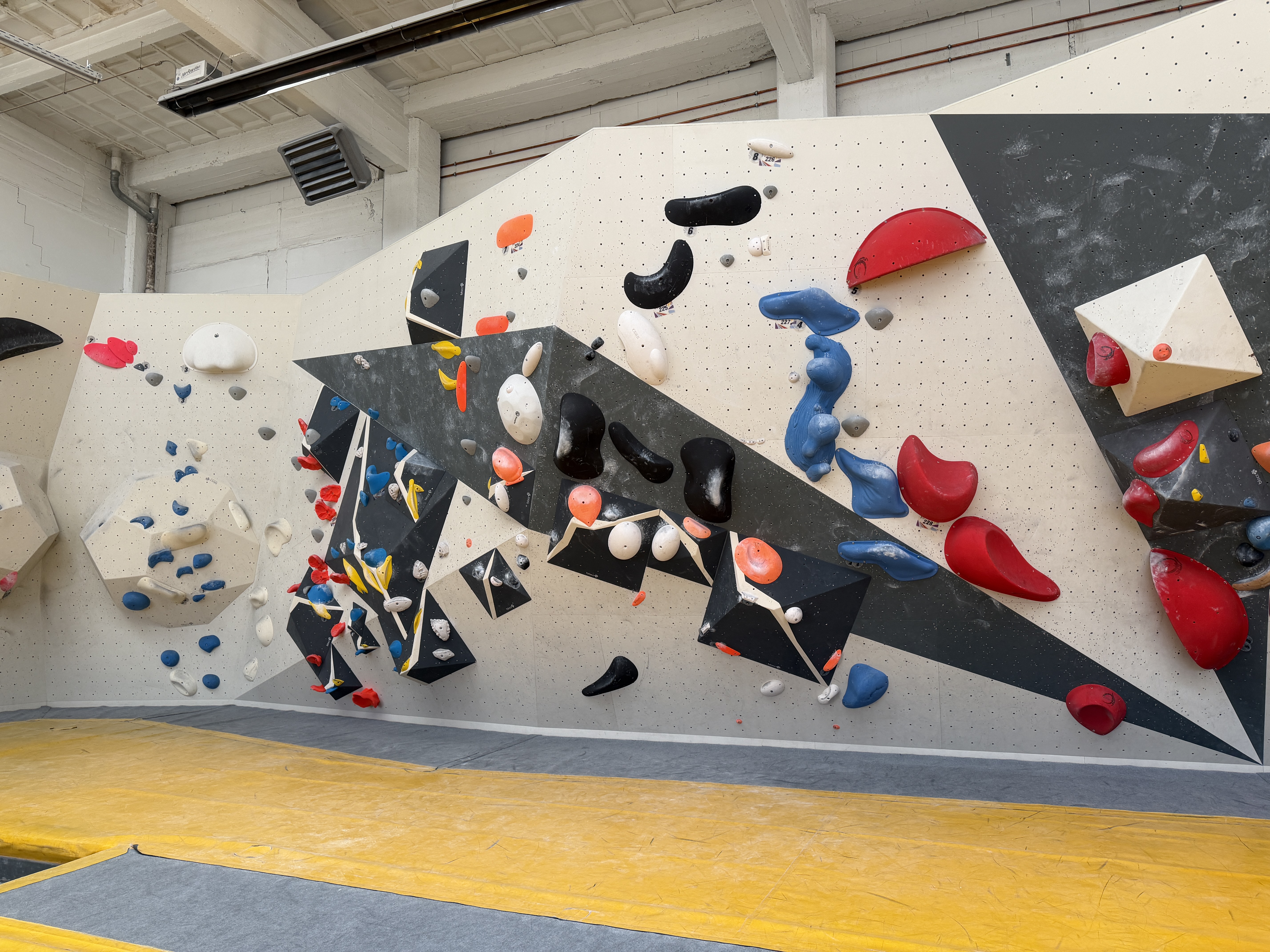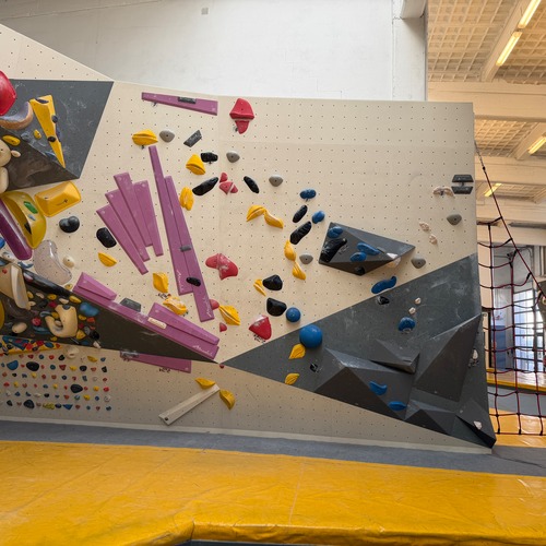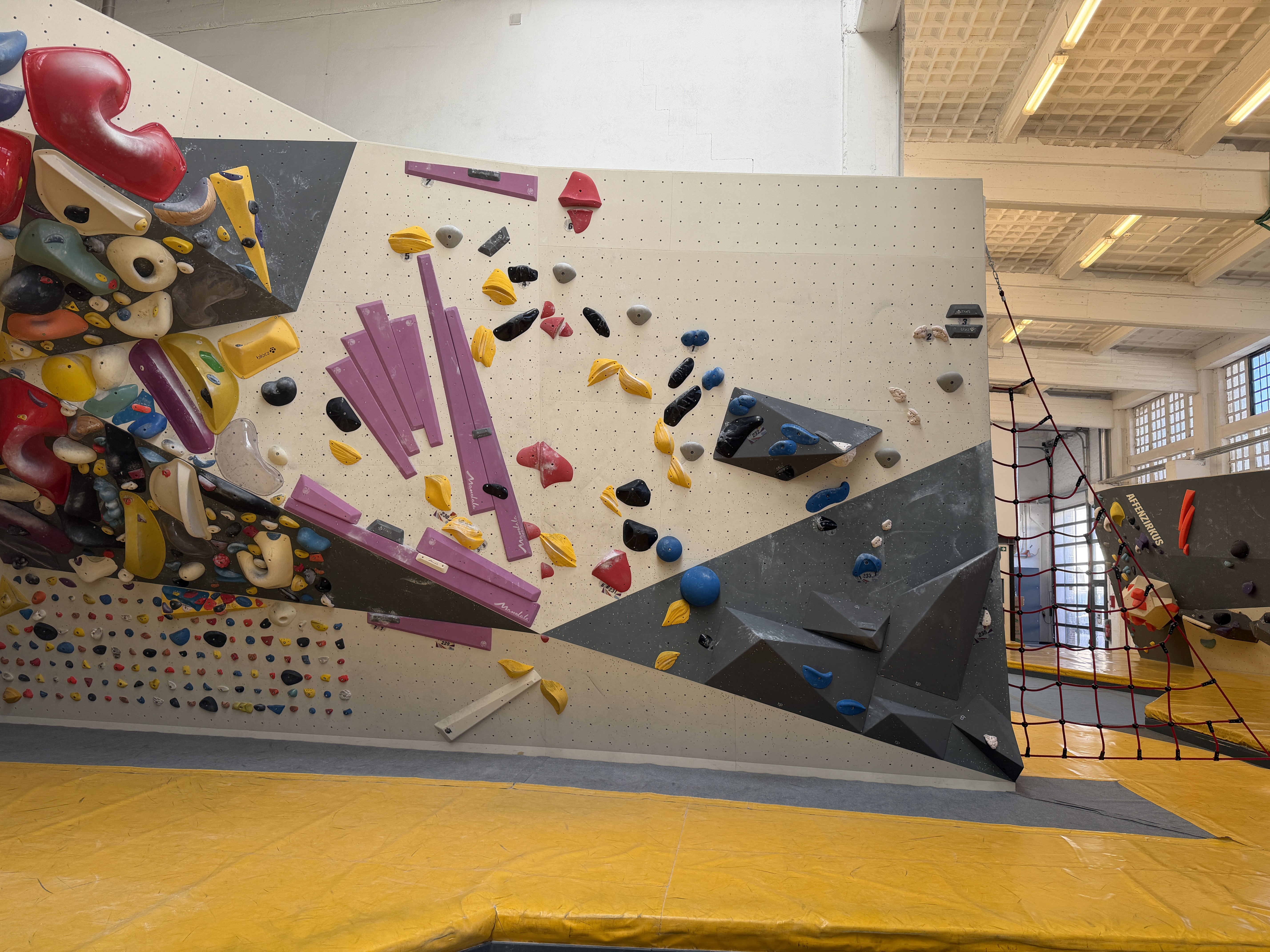 Der andere Wandbereich bildet dazu einen spannenden Kontrast: überwiegend plattig, mit variierenden Neigungen und einem leichten Überhang. Dadurch entsteht eine abwechslungsreiche Mischung aus kräftigen, technischen und bewegungsintensiven Boulderproblemen.