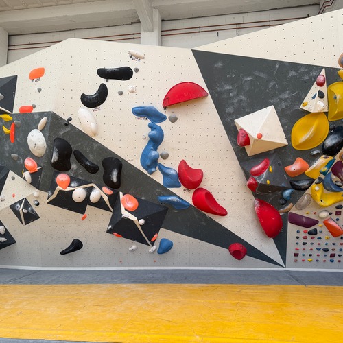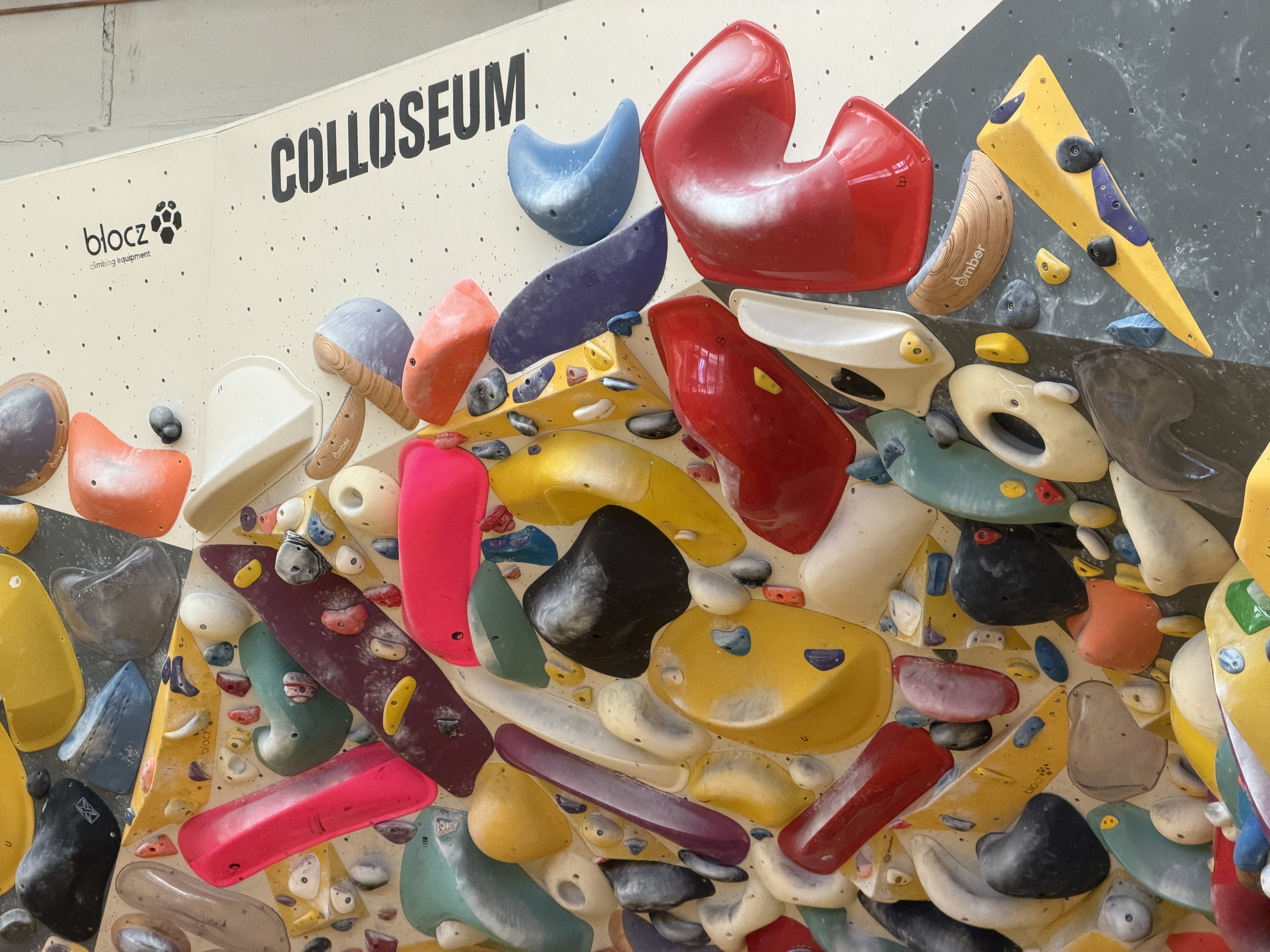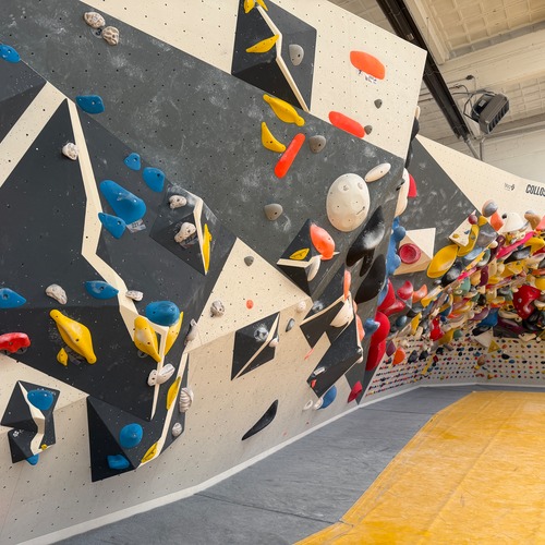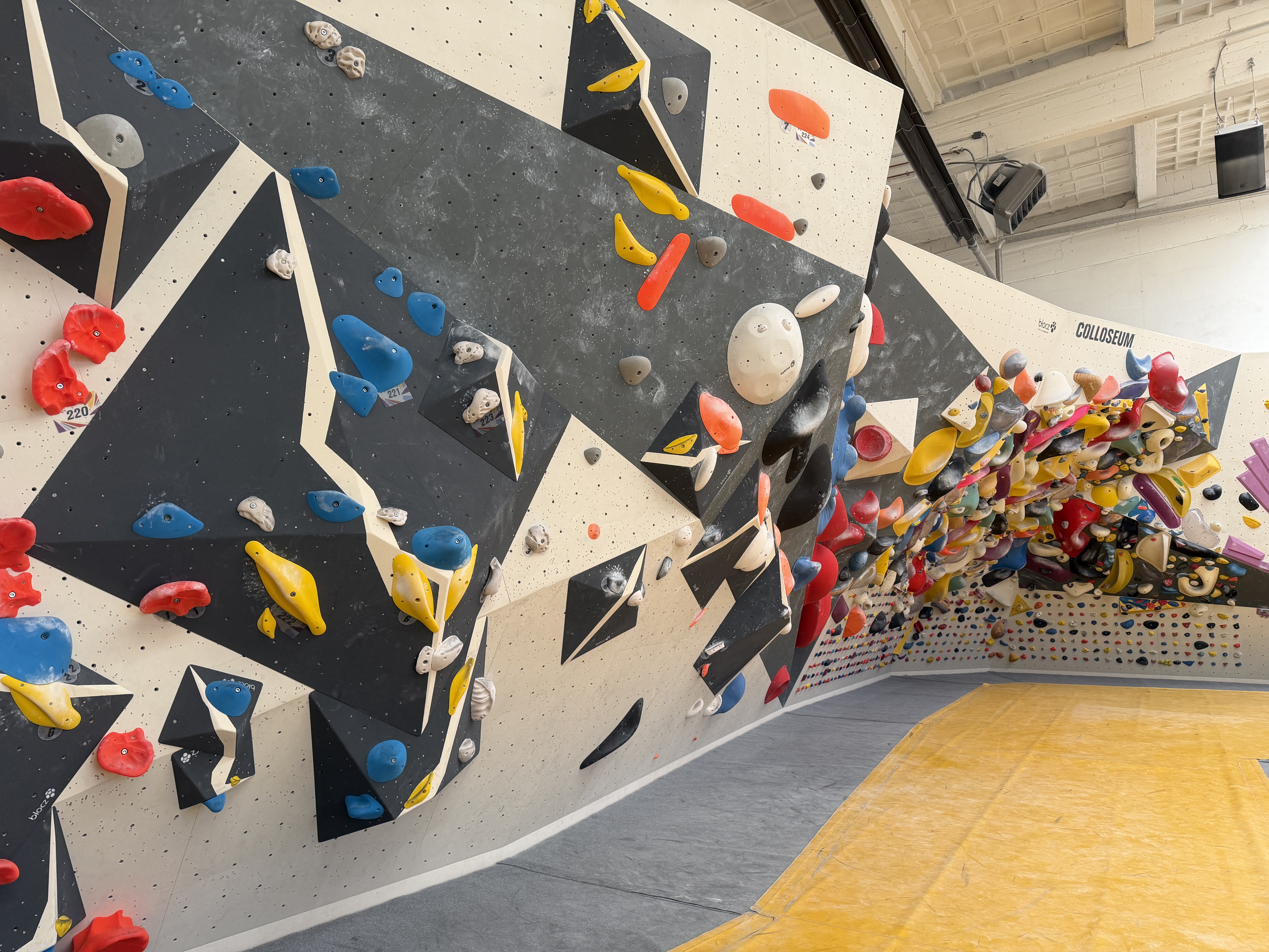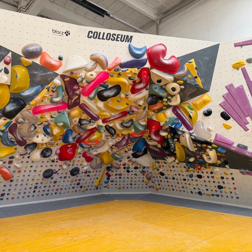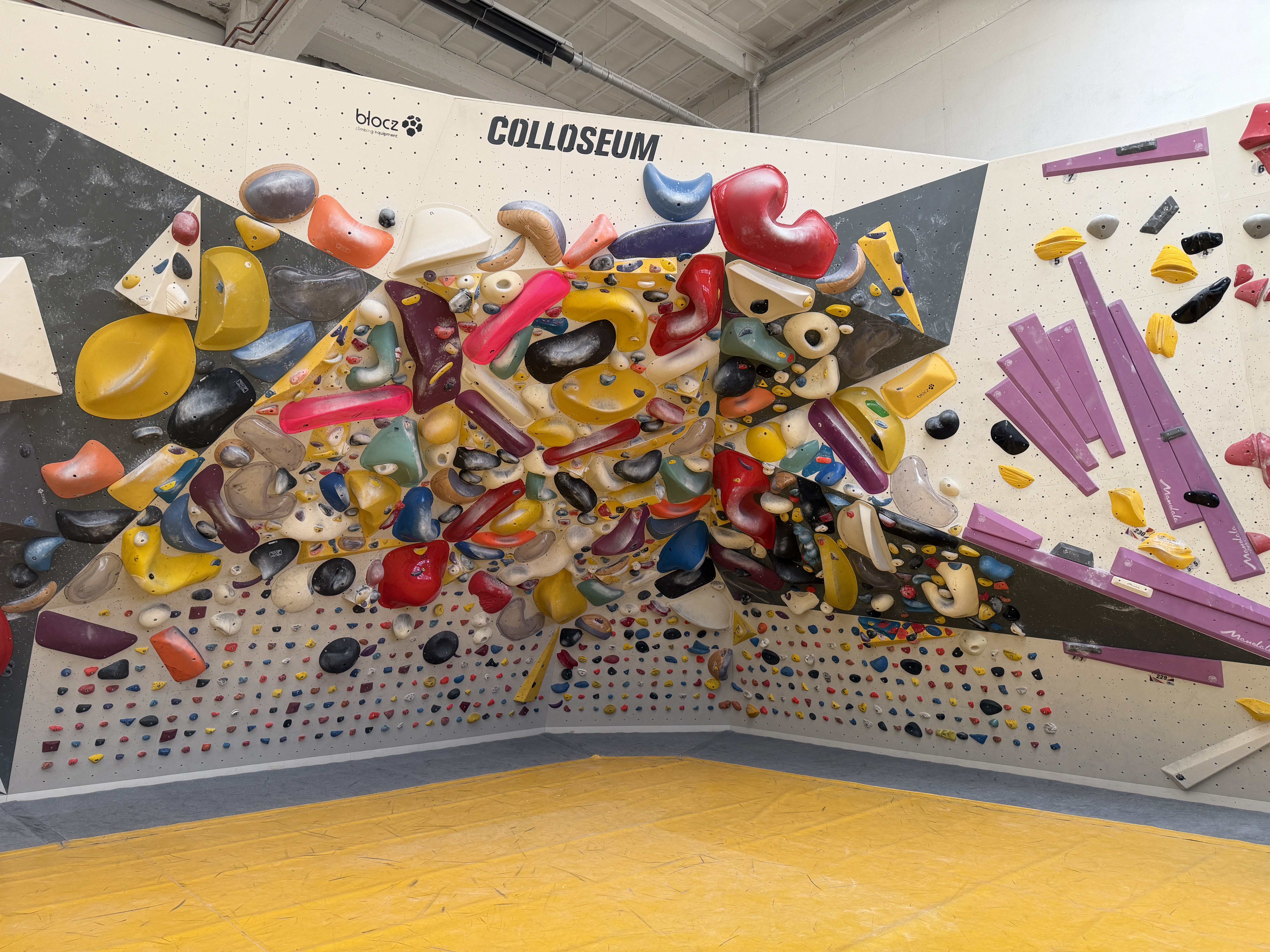 Der andere Wandbereich bildet dazu einen spannenden Kontrast: überwiegend plattig, mit variierenden Neigungen und einem leichten Überhang. Dadurch entsteht eine abwechslungsreiche Mischung aus kräftigen, technischen und bewegungsintensiven Boulderproblemen.